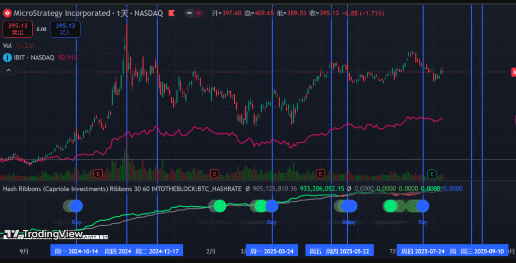2025年3月24日Hash Ribbons在日线级别出现蓝色买入信号,过了46天后,MSTR在2025年5月9日达到阶段性高点,IBIT在2025年5月22日达到阶段性高点,两者时间相差13天,在此期间IBIT涨幅大概是7%。